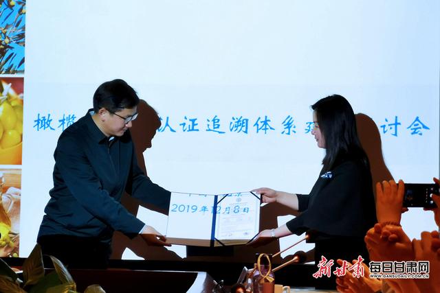 會上,主辦方向隴南市祥宇油橄欖開發(fā)有限責(zé)任公司頒發(fā)了中國首張?zhí)丶壋跽ラ蠙煊驼J證證書。